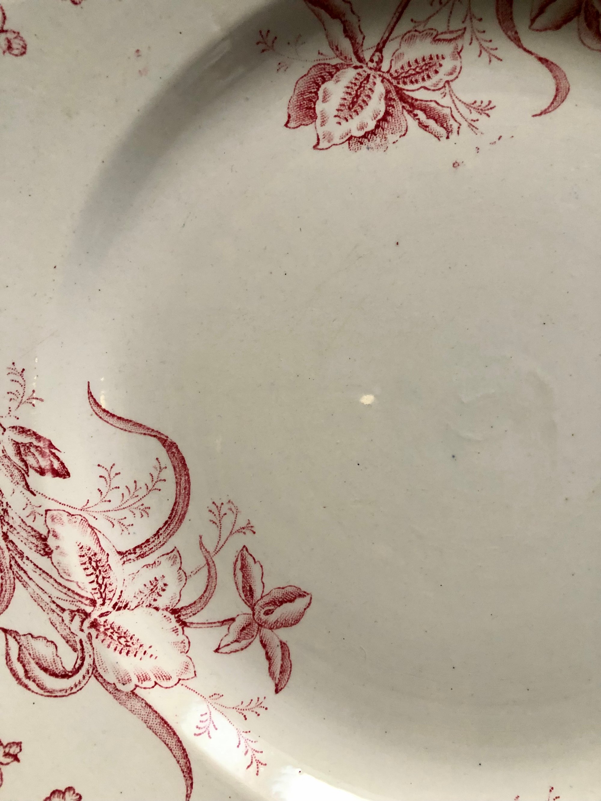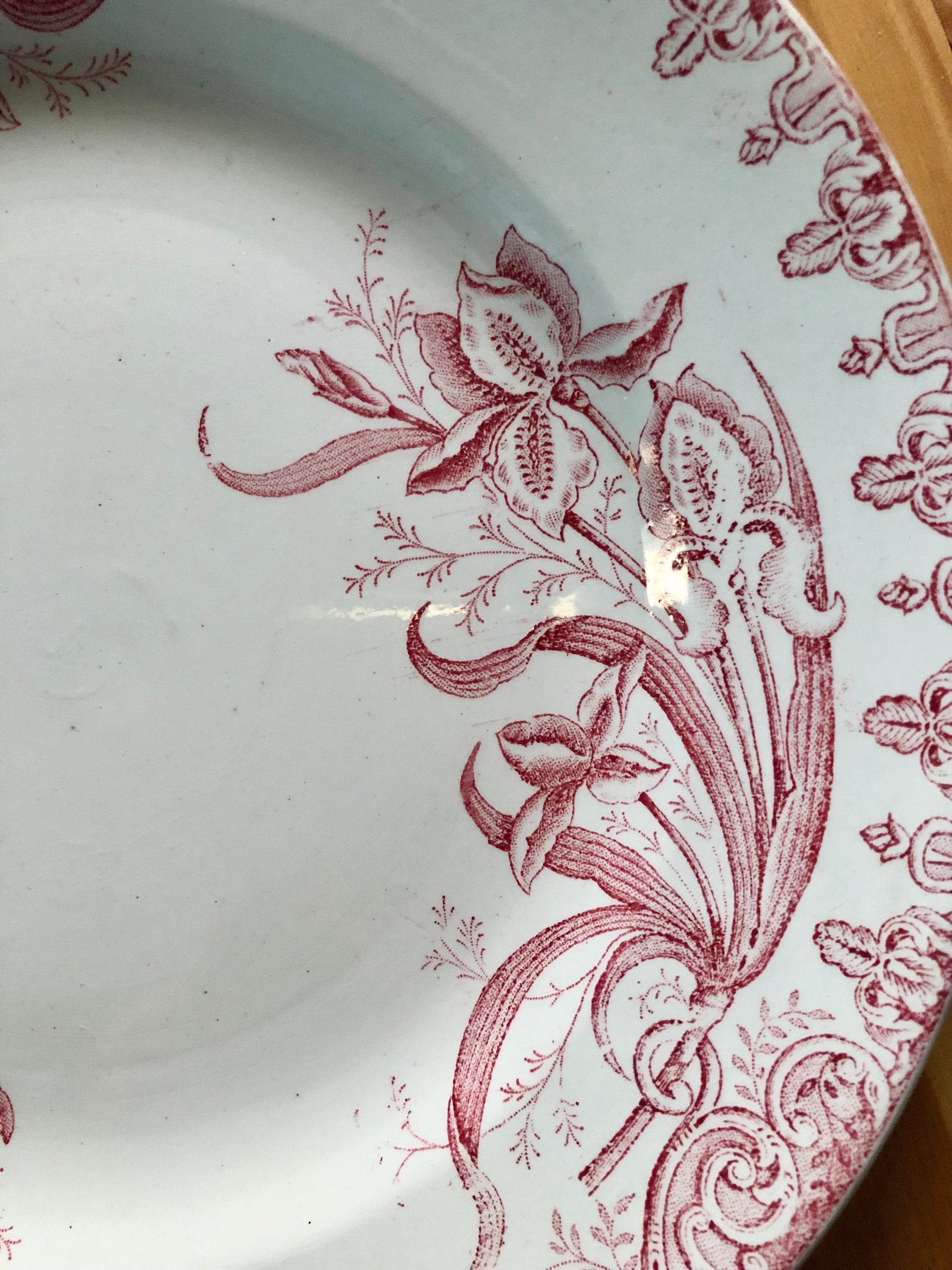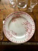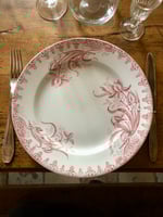 Élégante assiette plate en terre de fer, décorée d’un motif floral Iris dans de belles nuances de rouge.