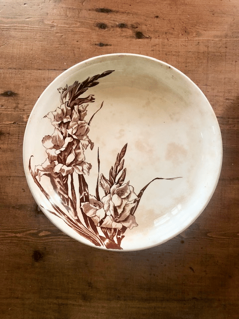 Décor floral délicat dans les tons bruns, évoquant des marguerites ou des glaïeuls, typique de l'esthétique romantique de l'époque.