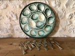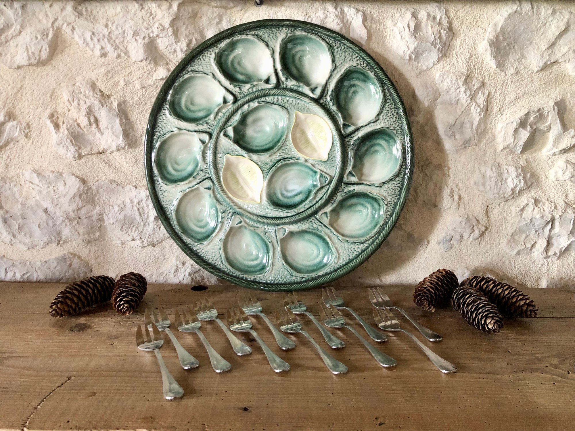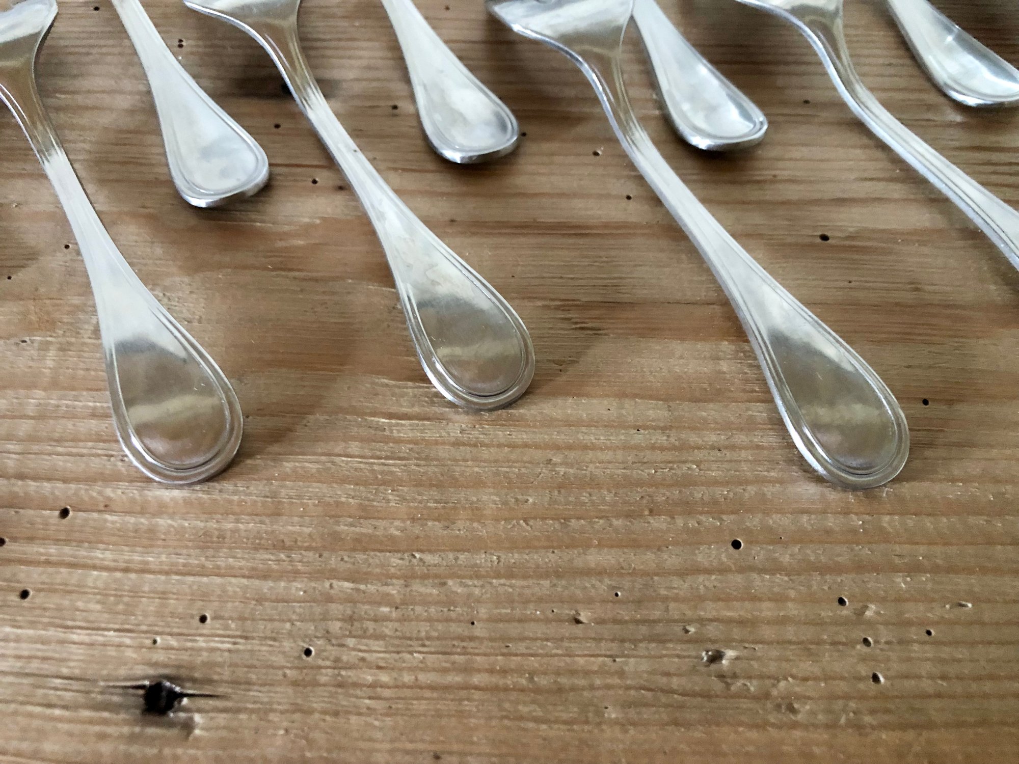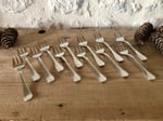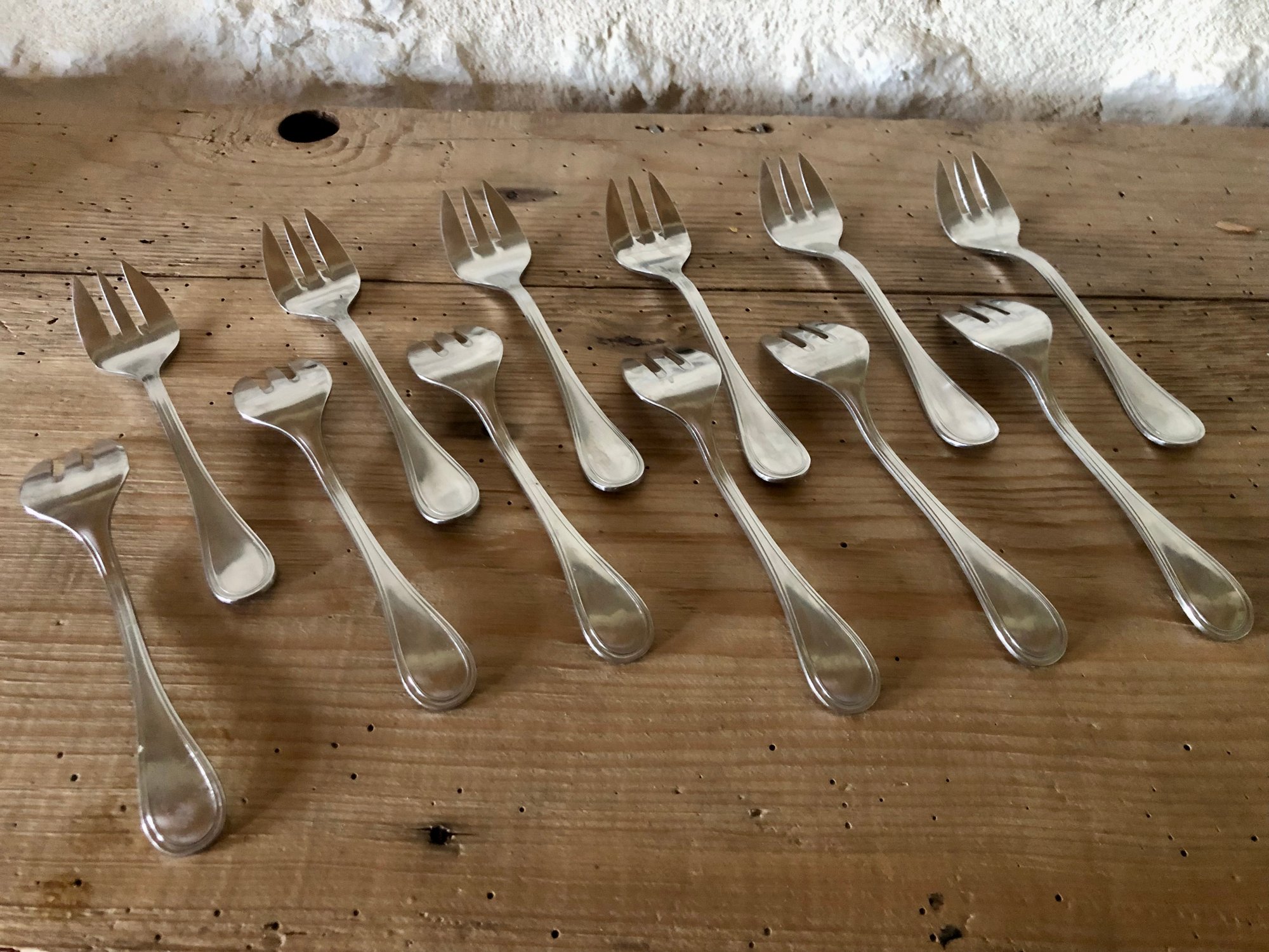 Set de 12 fourchettes à huitres Guy Degrenne anciennes, modèle Verlaine, en acier inoxydable.