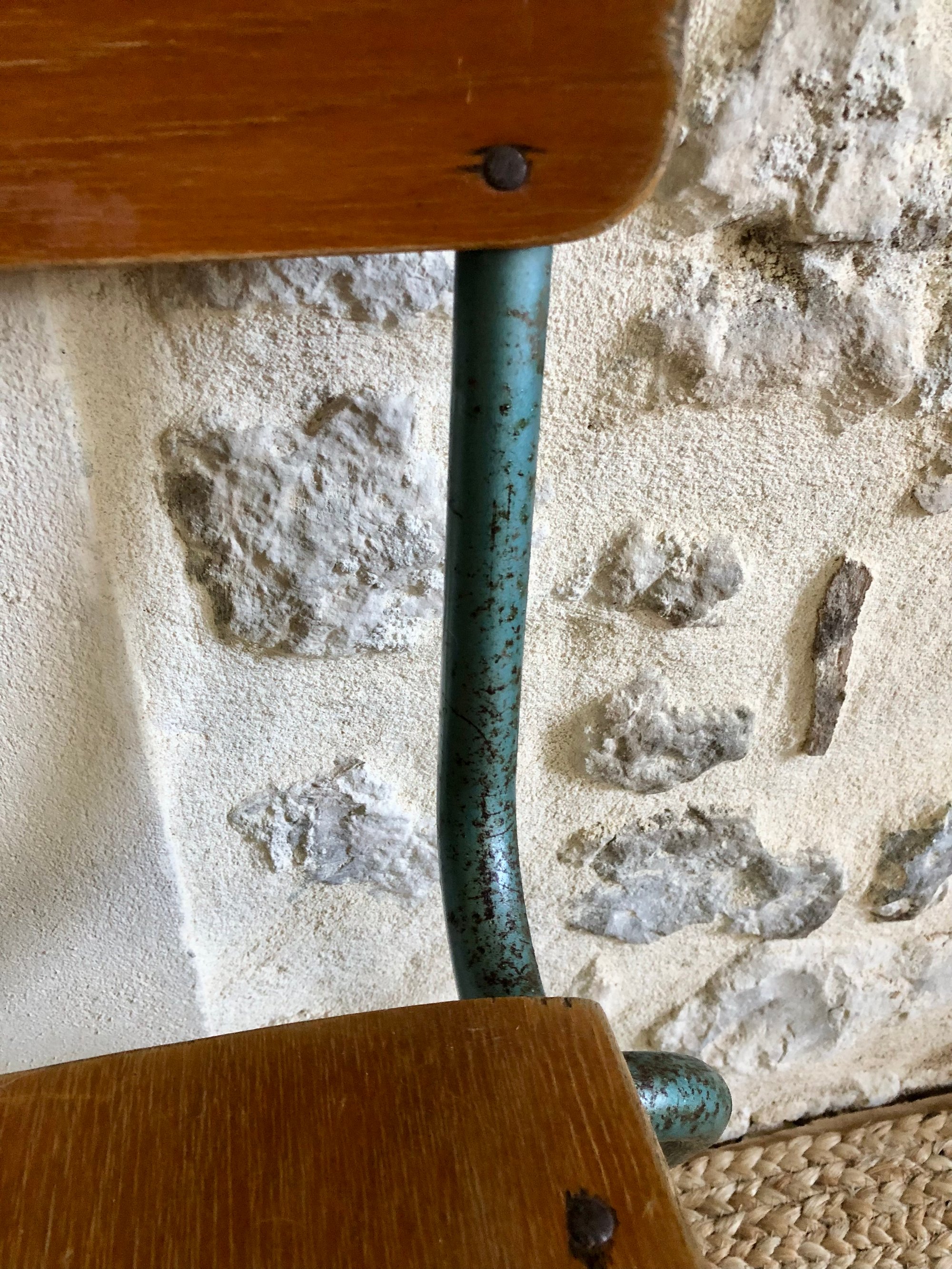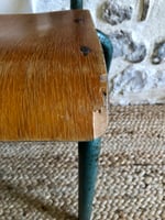 La bois est patiné, la structure en métal tubulaire est solide. Celle ci a été traitée à l’anti rouille afin de la stabiliser.