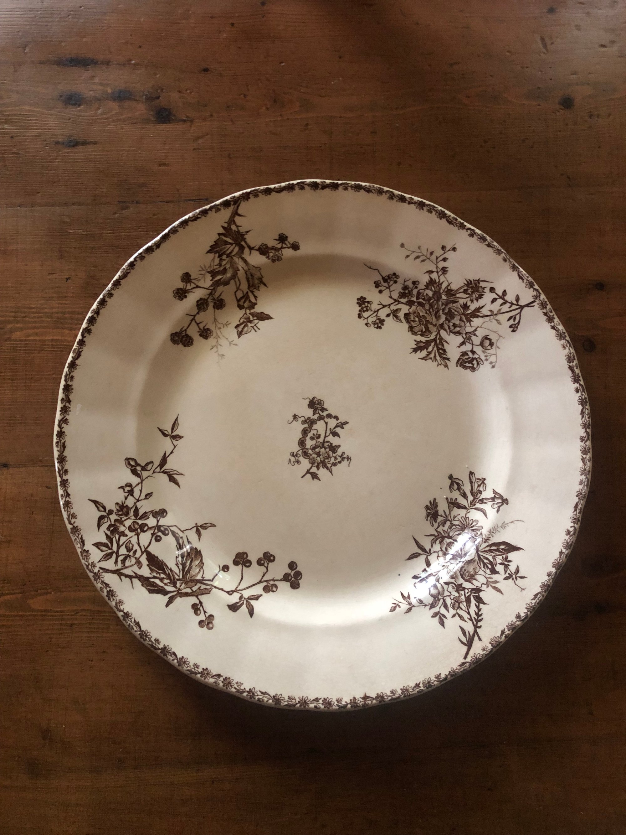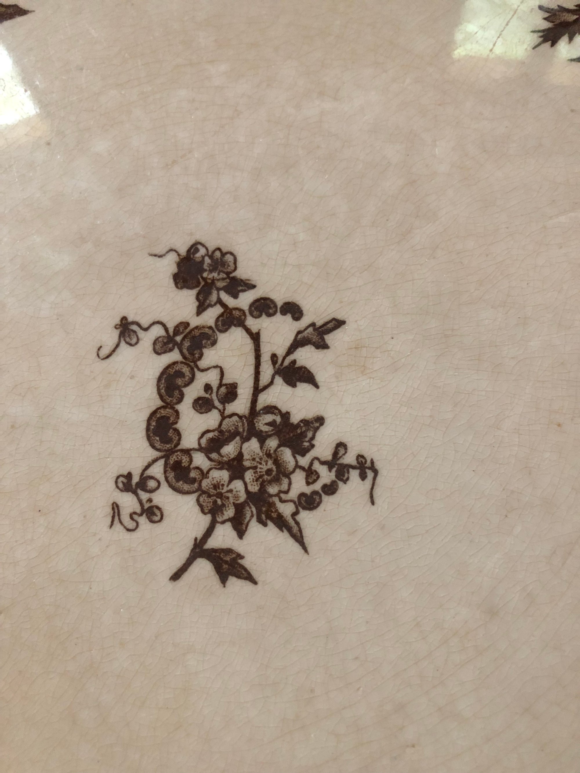 Il est finement décoré de fleurs et de feuillage dans les doux tons de brun, ce qui lui confère une élégance discrète et intemporelle.