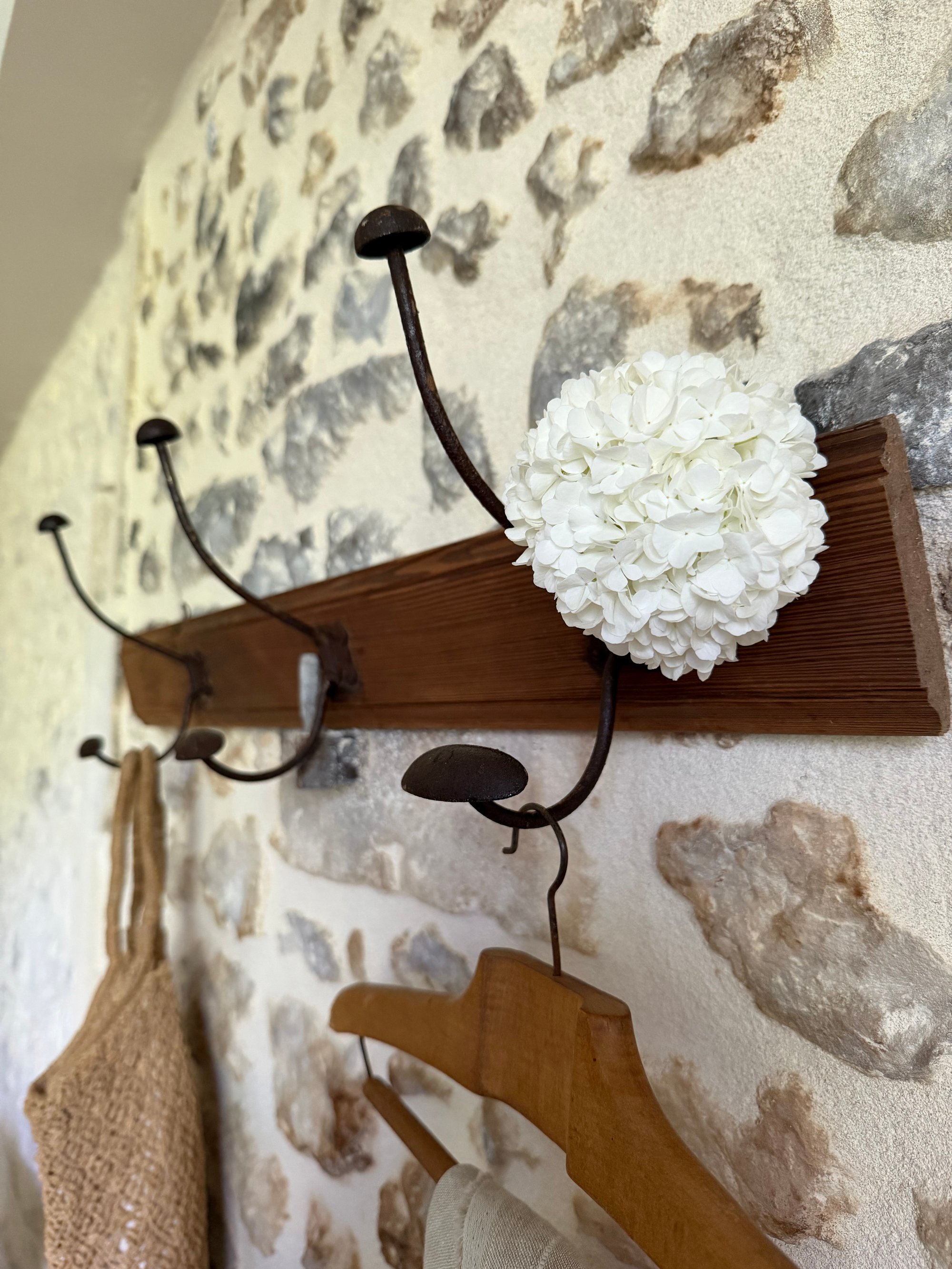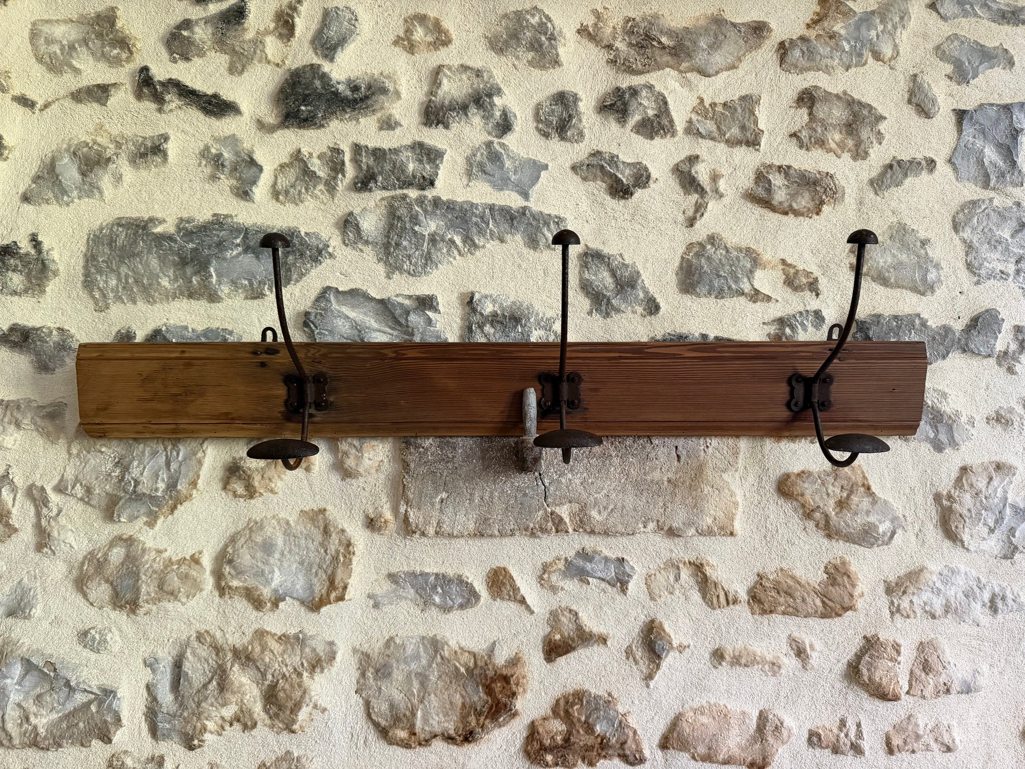 Porte manteau ancien en bois, doté de 3 patères en métal dans un esprit campagne, ou à assortir avec des meubles de métier.