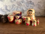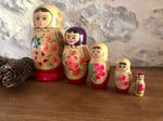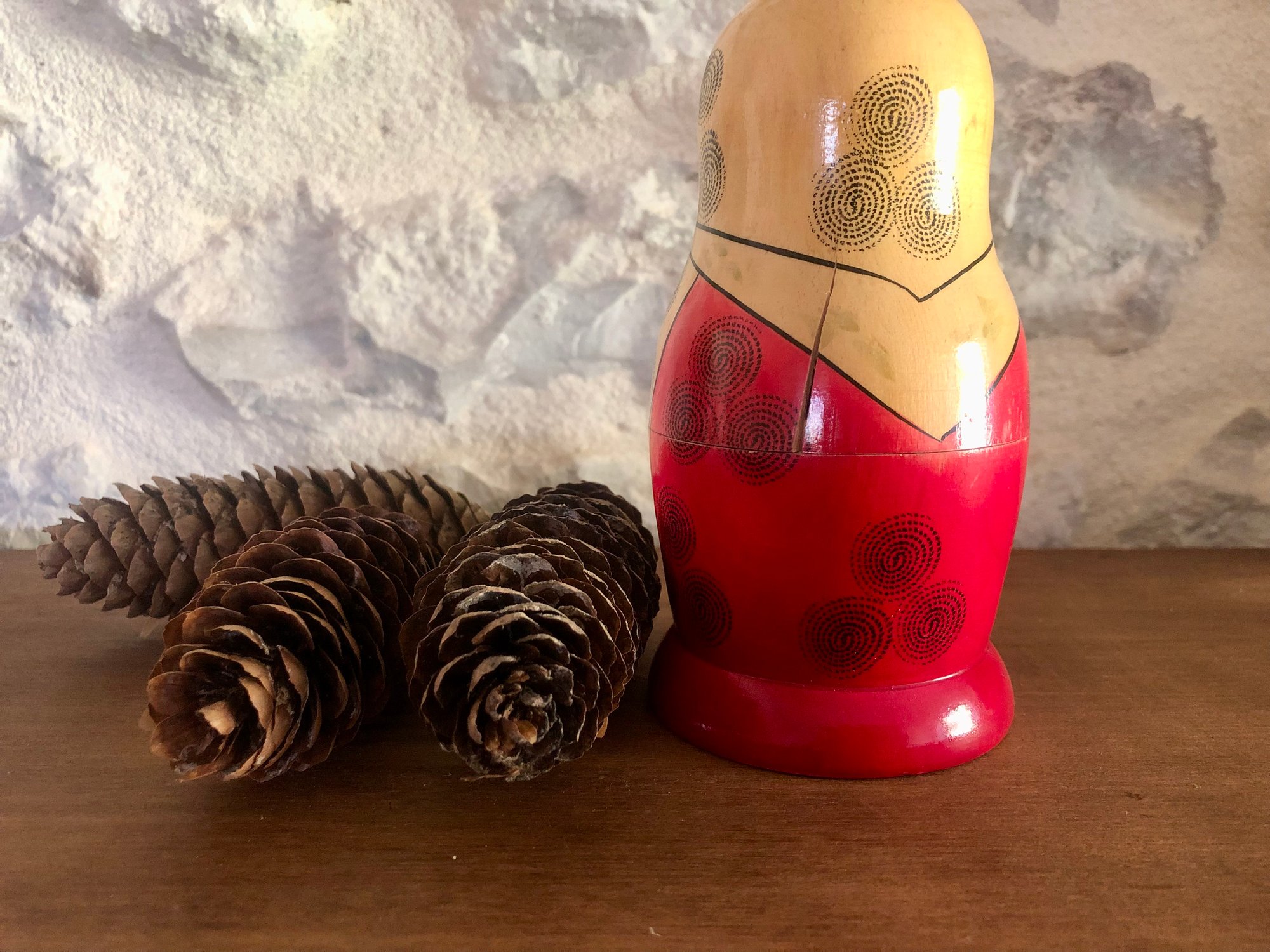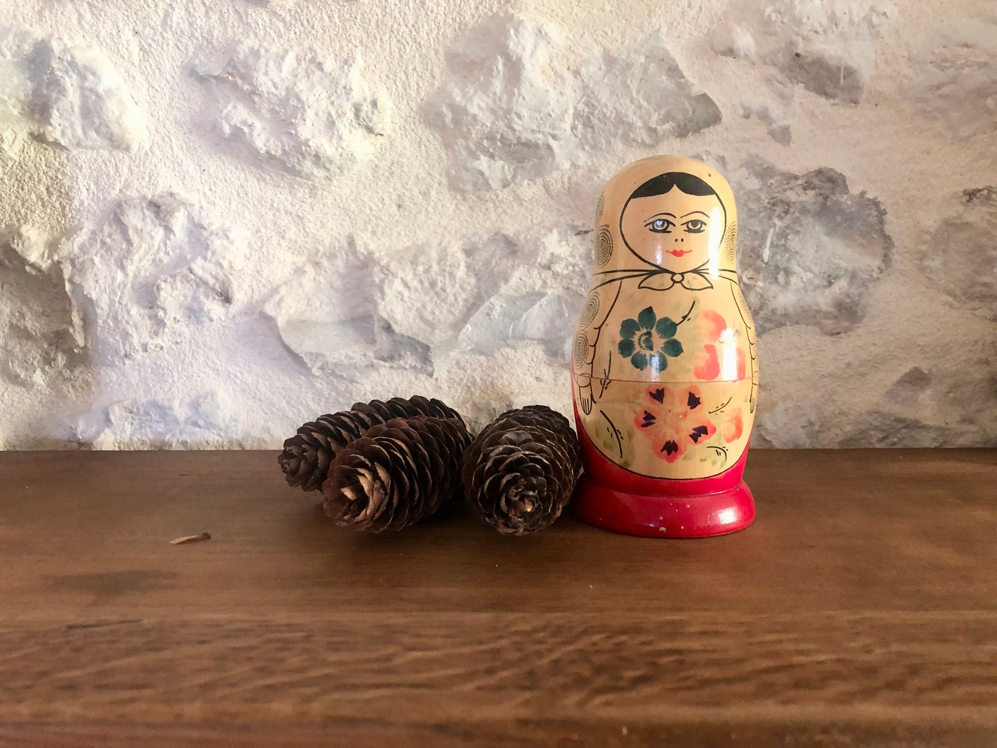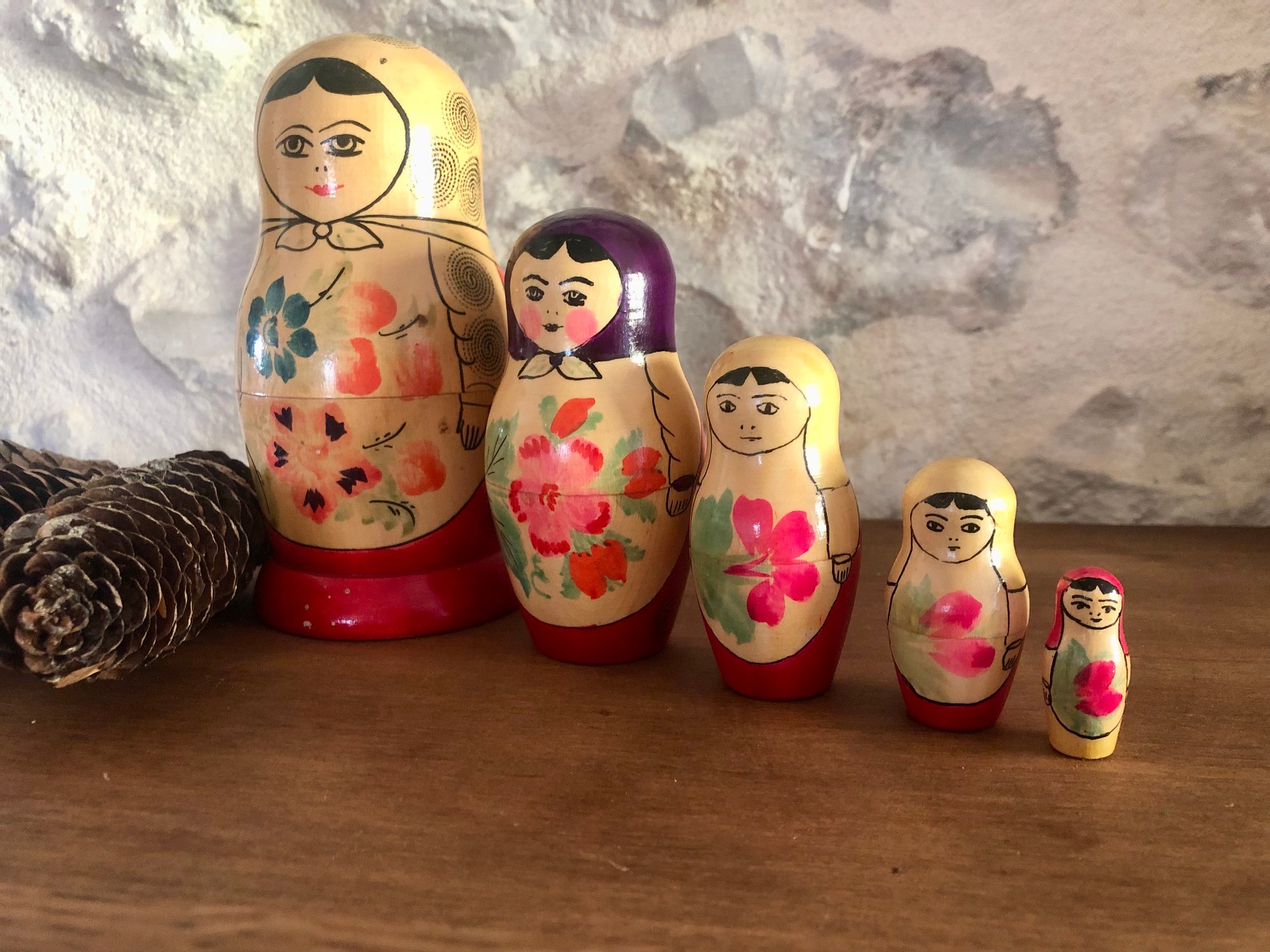 Ces poupées russes gigognes Matriochka, entièrement en bois et peintes à la main, semblent tout droit sorties d’un coffre ancien rapporté d’un long voyage.