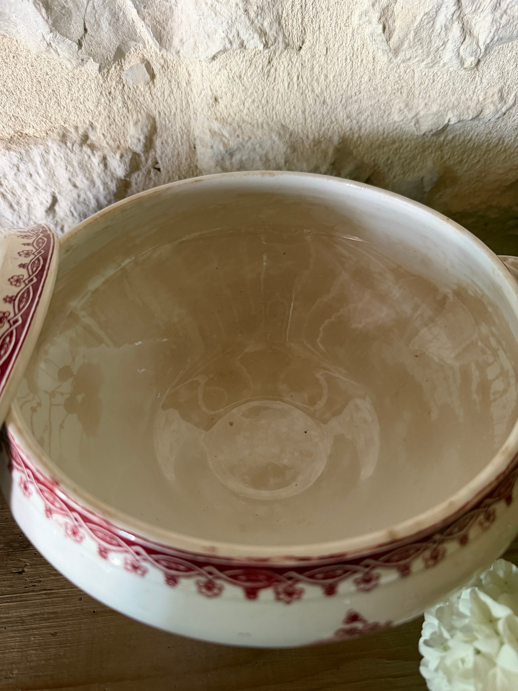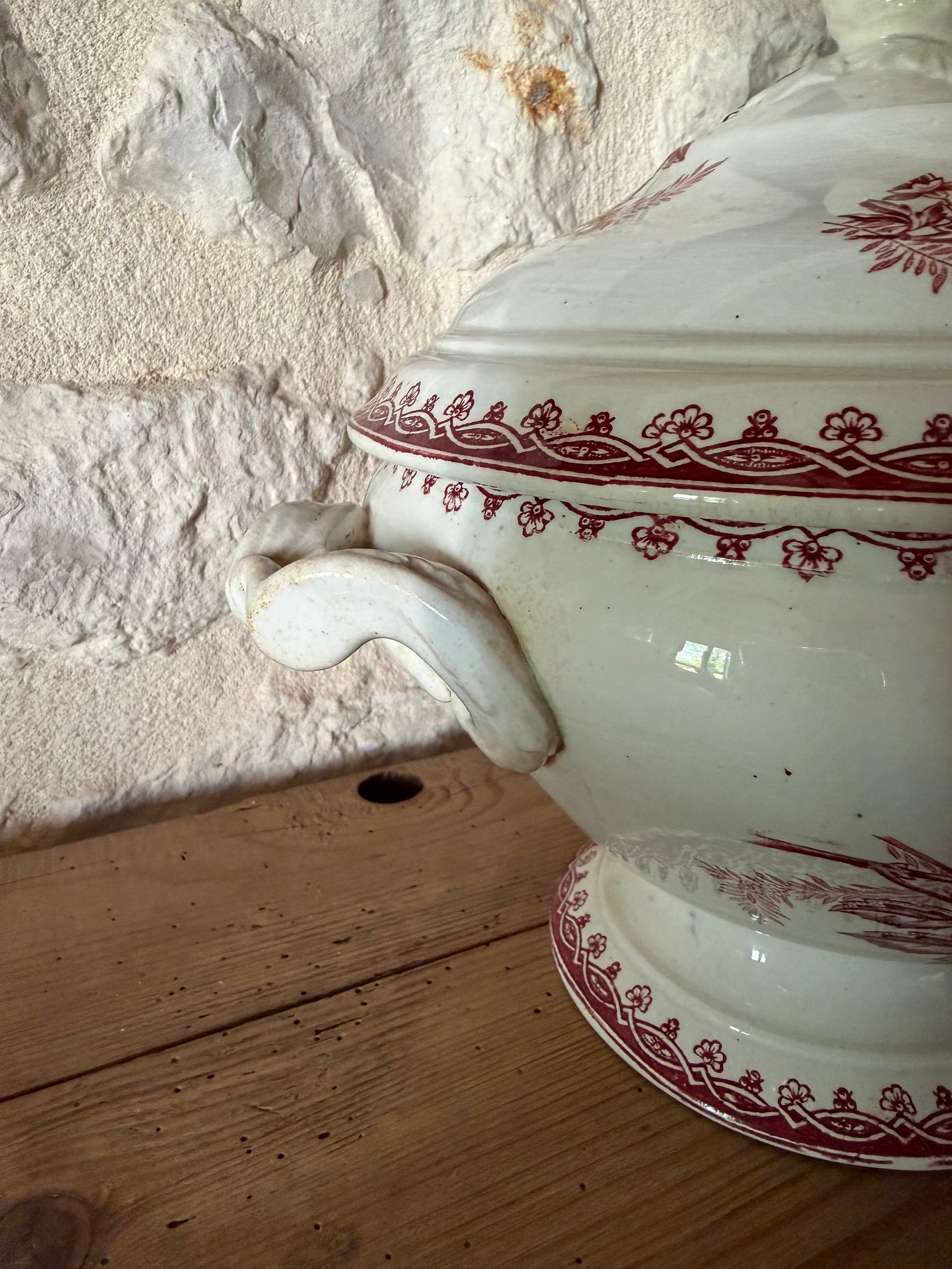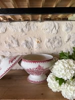 Soupière en terre de fer blanche et rouge, de la belle faïencerie française Saint Amand, société Amandinoise. Modèle Margot à décor de fleurs. Une belle pièce d'art de la table ancienne.