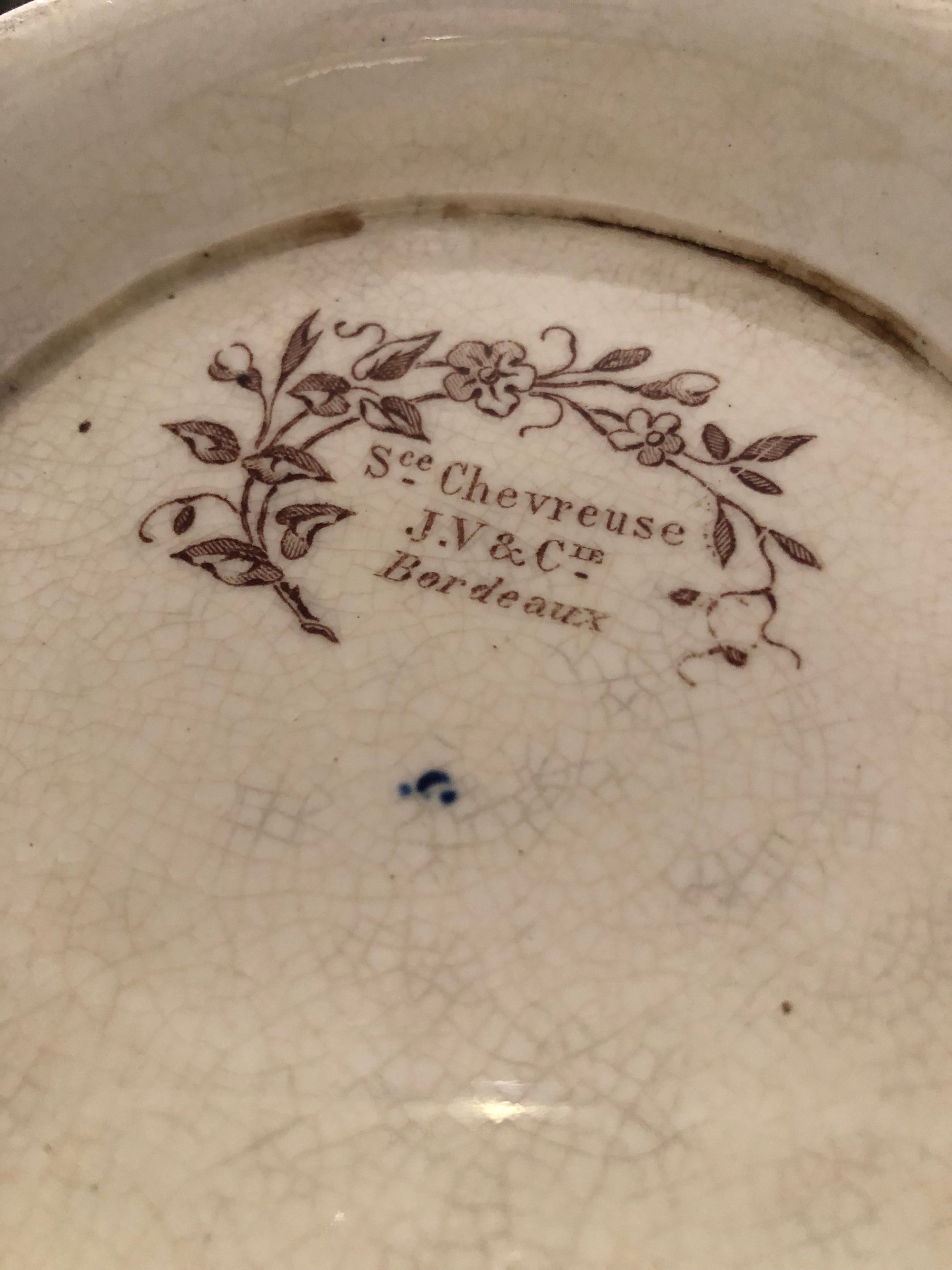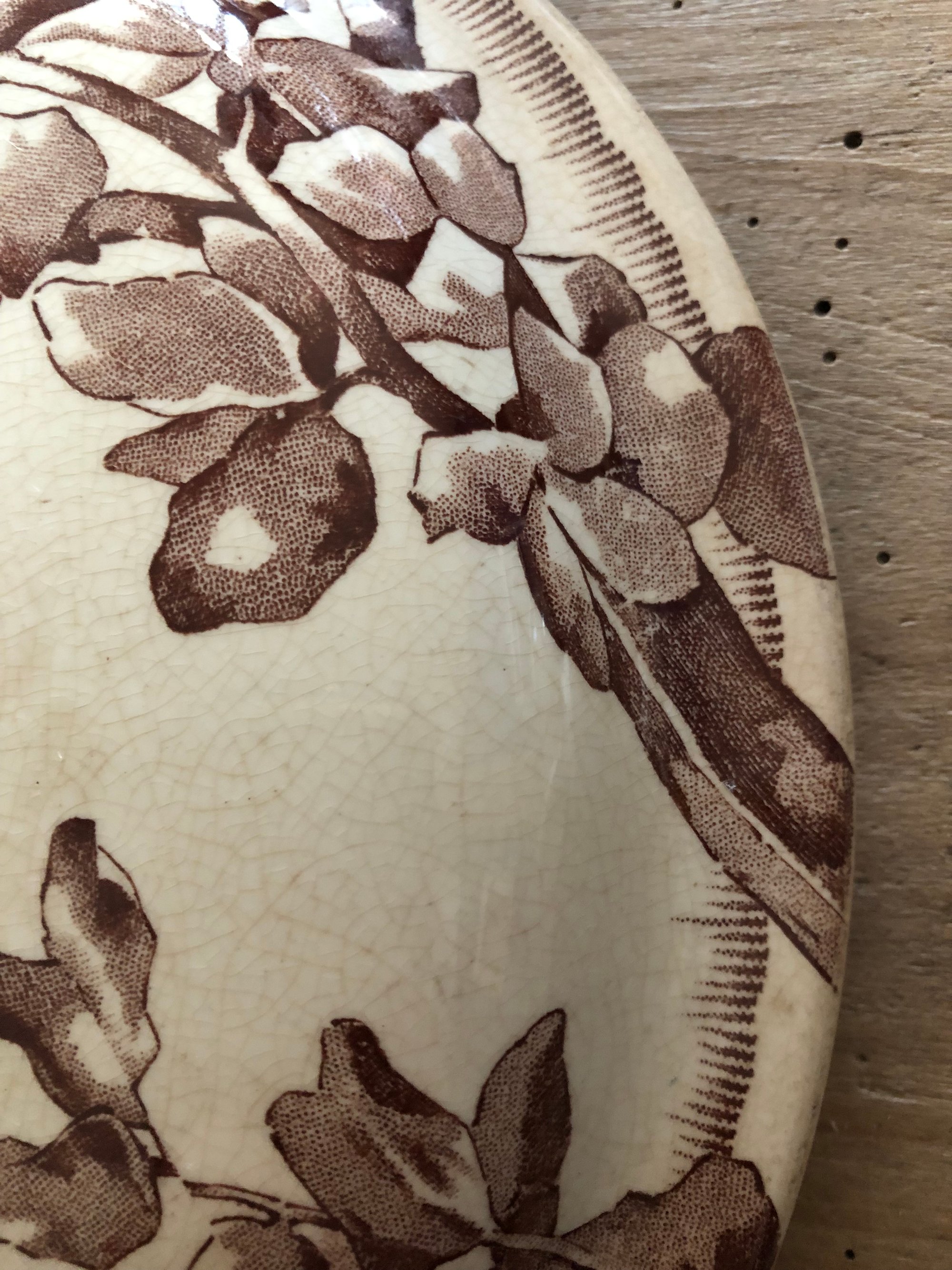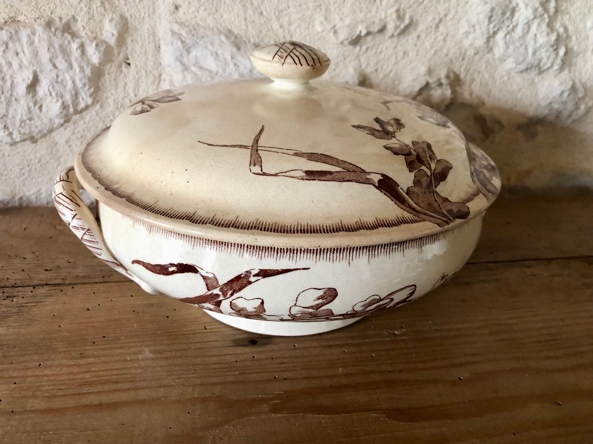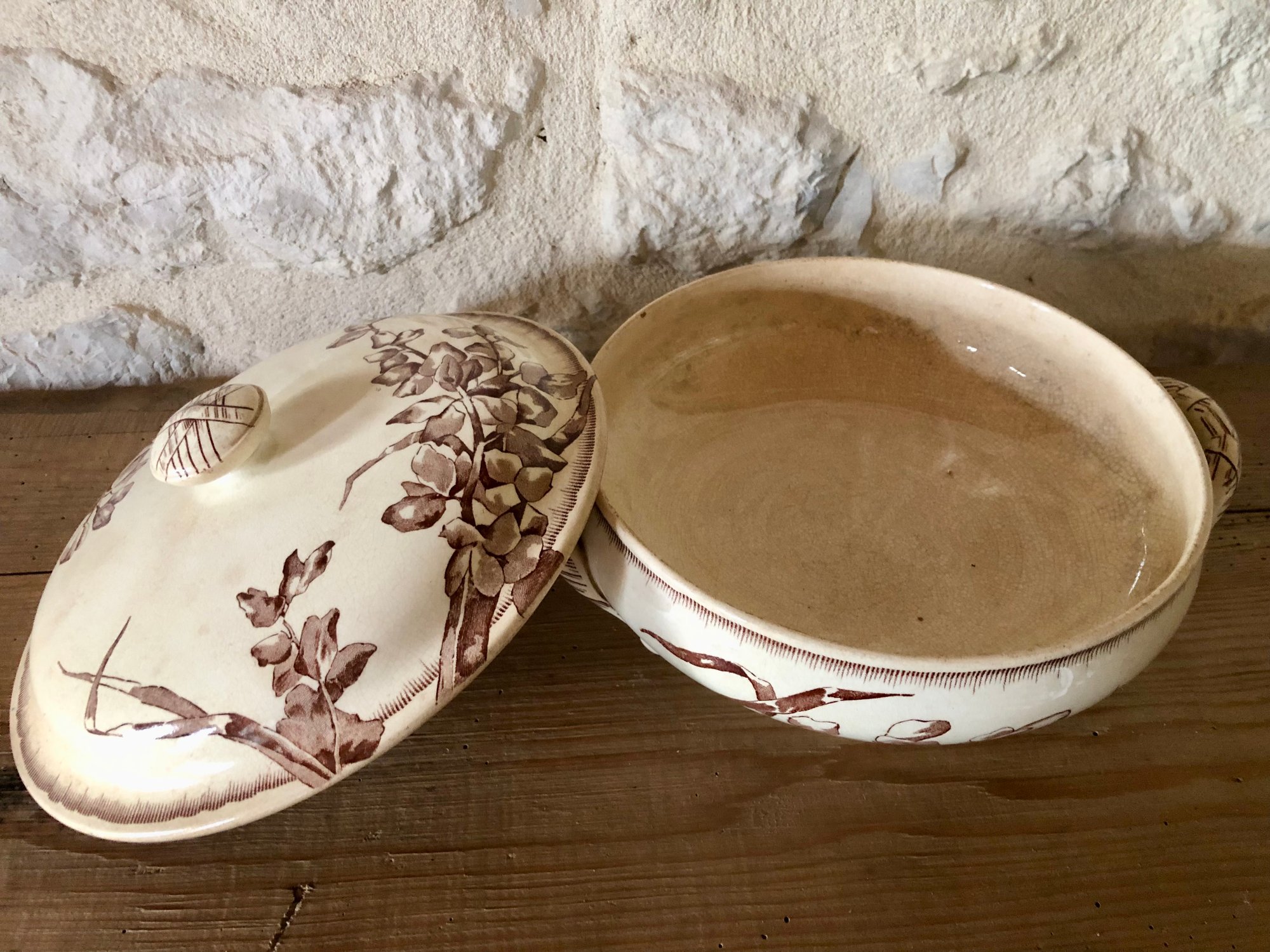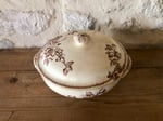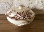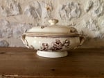 Elégante soupière, qui peut également se réinventer en corbeille à fruits, à motifs floraux dans les doux tons de brun. Modèle Chevreuse de la célèbre manufacture française de Bordeaux Jules Vieillard, un des symboles du savoir faire de l'époque.