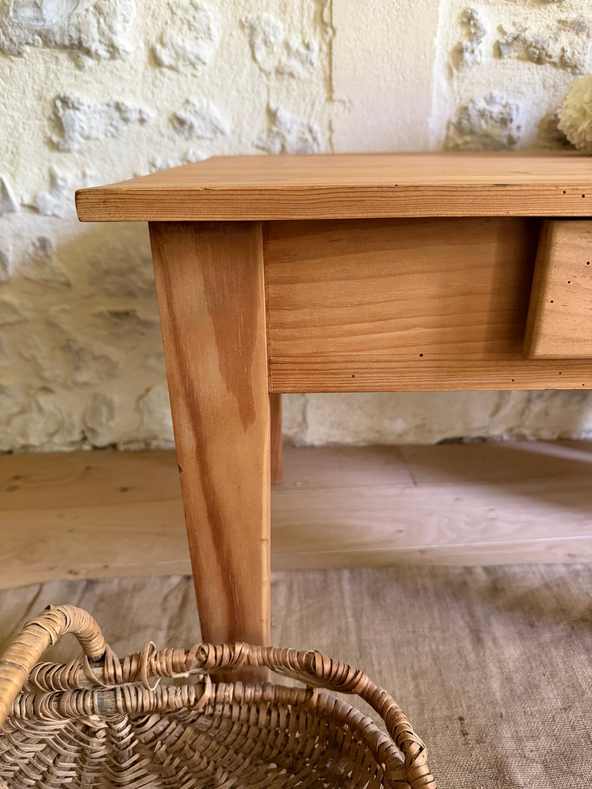 Elle a été soigneusement rénovée: poncée, traitée contre les parasites du bois, puis protégée au vernis mat incolore, afin de mettre en valeur ses jolies marques du temps et de conserver sa belle patine.
